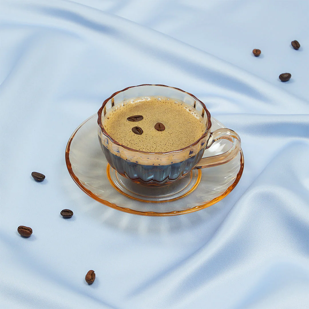 laser engraved "espresso" logo mug with matching saucer in amber glass.