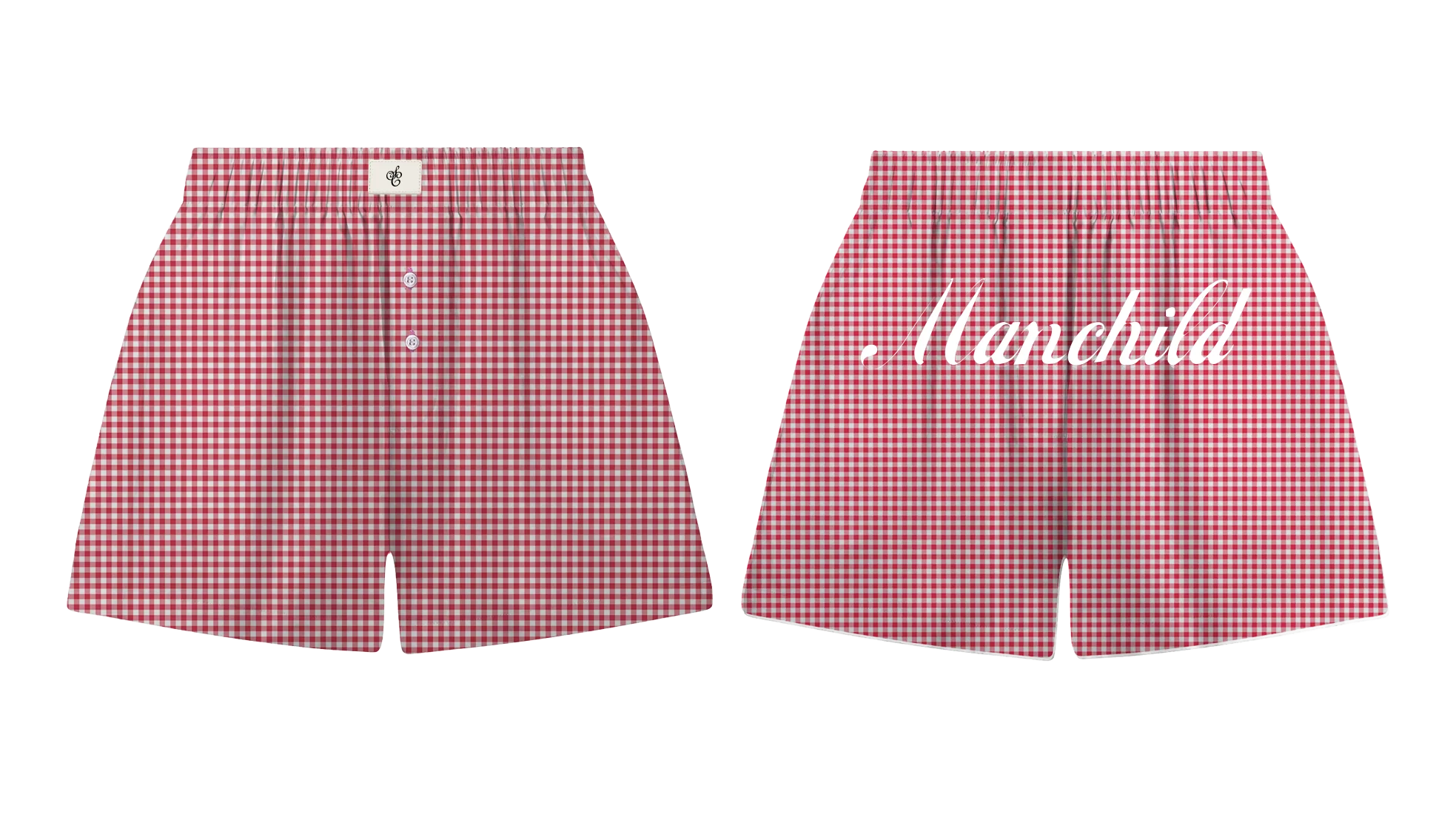 Red checker boxers featuring SC woven label on wearer's front waistband and "Manchild" printed on back.