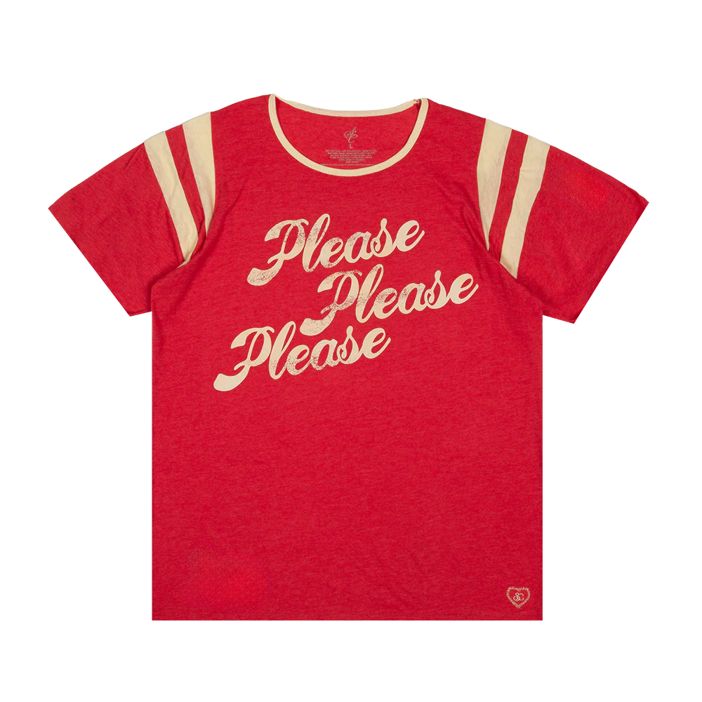 red ringer tee with contrast trim at shoulders and screen printed Please Please Please graphic.