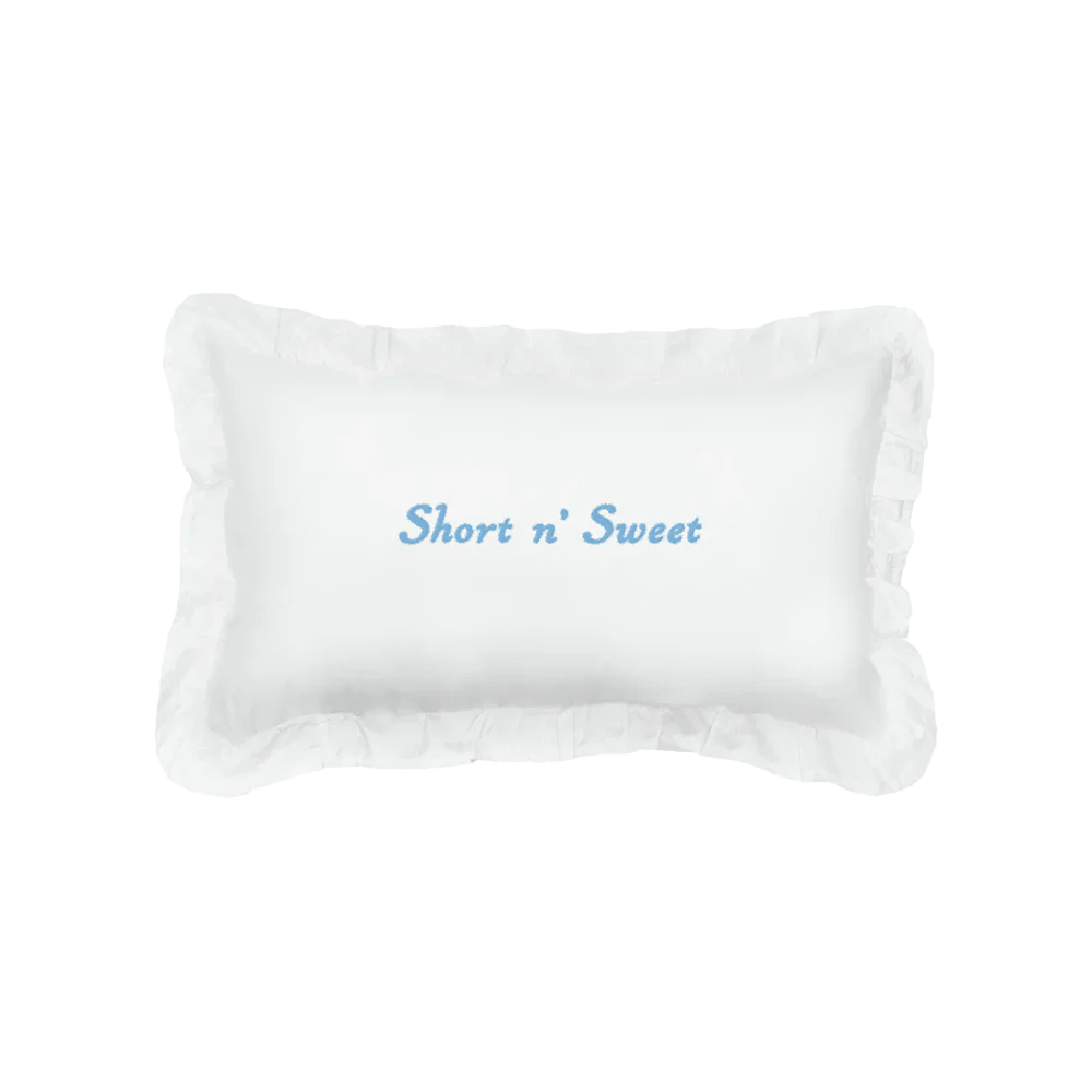 white velvet pillow with "Short n' Sweet" embroidered logo. 11" w x 7" h.